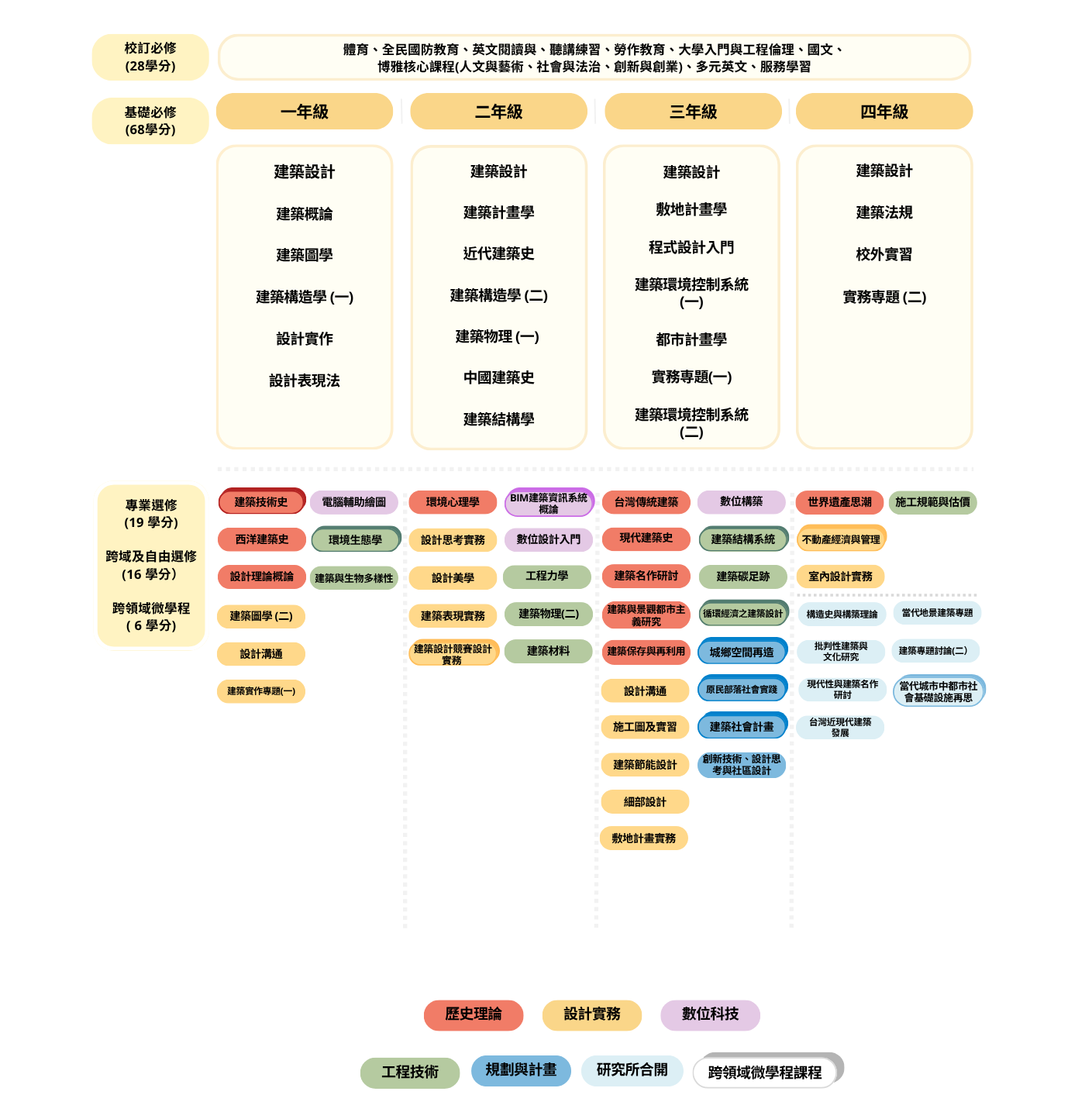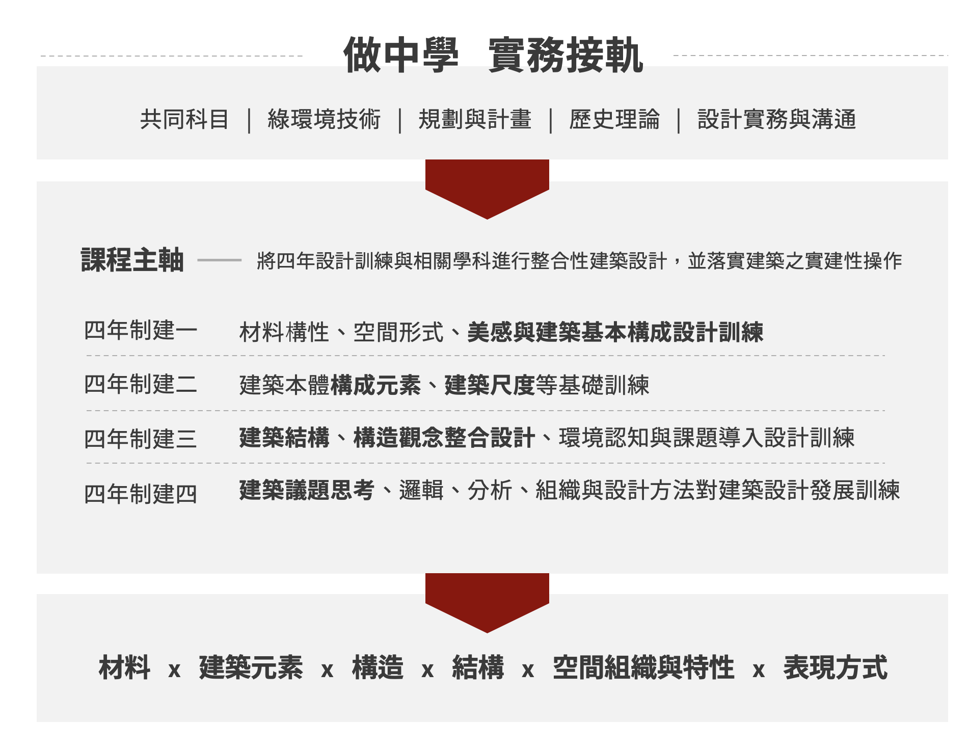 本系為國內最早創立之國立建築系之一,大學部以「建築設計為核心、理論與技術並重」為主軸,培養具創意與專業實作能力的建築人才。系上採小組教學與評圖制度,強化構思、表達、協作與批判能力;並鼓勵參與競圖、實構建造與場域合作、校外專題及國際交流,拓展視野與實務經驗,為未來進入建築、都市設計、景觀及研究領域奠定基礎。都會型校園與國際交換常態化,外籍與僑生多元,讓學生在真實情境中累積作品集與專業素養。課程地圖清楚標示學期重點與能力累積,協助學生規劃選課、競賽與實習節奏,逐步建立升學與就業所需之核心素養。