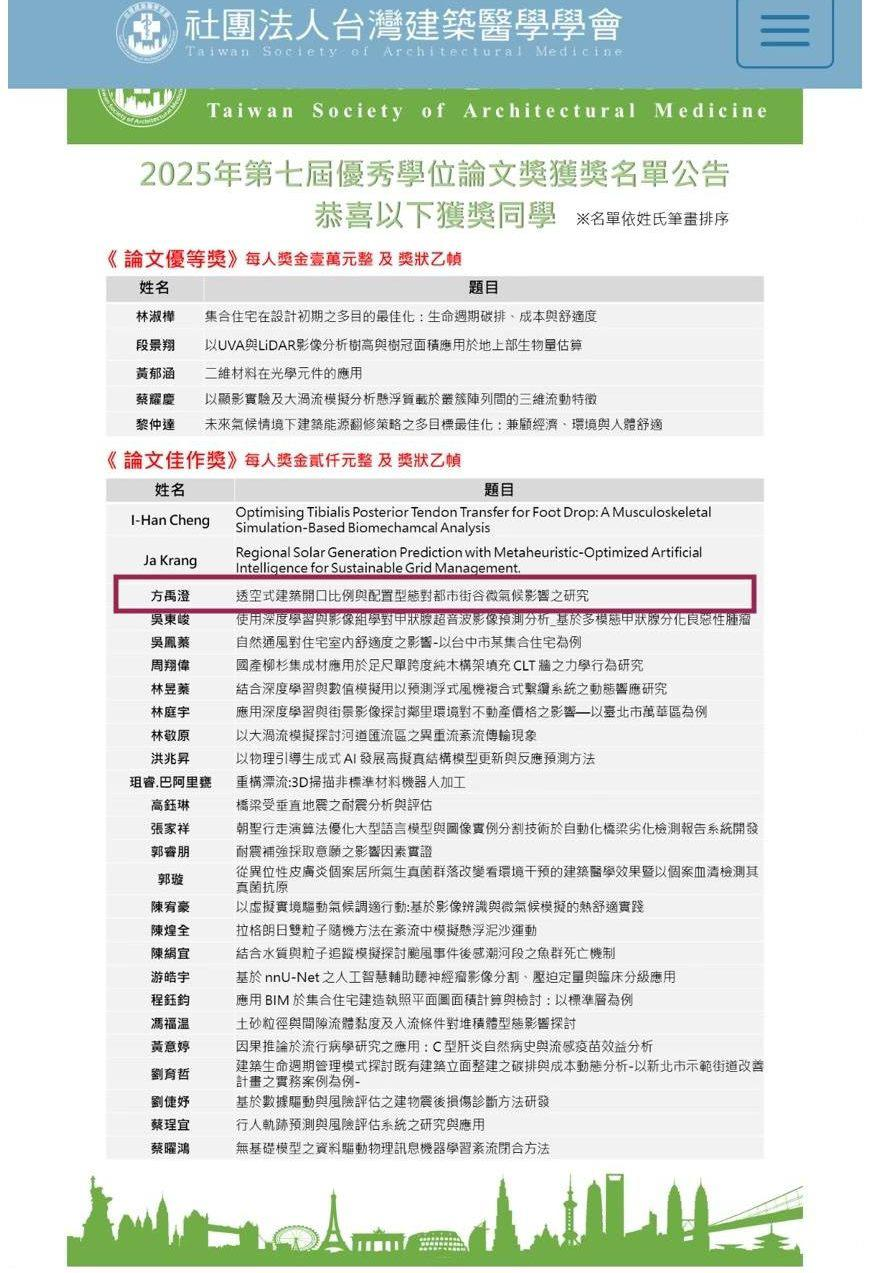 【2025年第七屆優秀學位論文獎-論文佳作獎】 本校建築系 方O澄 同學榮獲社團法人台灣建築醫學學會 📘得獎論文:〈透空式建築開口比例與配置型態對都市街谷微氣候影響之研究〉 👩🏫 指導教授:蘇瑛敏 教授